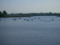 Der See hat eine durchschnittliche Tiefe von ca. 70 cm und beherbergt die größte binnenländische Lachmöwenkolonie Mitteleuropas. Seit einigen Jahren brüten auf einer Insel auch Flamingos, die vermutlich ursprünglich aus Tiergärten entflohen sind. Bereits mehrmals sind erfolgreich Jungtiere großgezogen worden, die zusammen mit den Altvögeln im Rheinmündungsgebiet überwintern. Manfred Jander erklärte uns, dass ohne gezielte Maßnahmen, wie sie von der Biologischen Station Zwillbrock durchgeführt werden, Moore und Heide nicht erhalten werden. So werden die stark wasserverbrauchenden und beschattenden Birken entfernt und die Wiederherstellung günstiger Feuchteverhältnisse forciert. Die Station hat eine eigene Moorschnuckenherde, die Schafe verbeißen Pfeifengras und Birkenjungwuchs und tragen zur Verjüngung der Heidepflanzen bei.