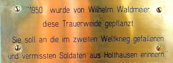 Der Text lautet: "1950 wurde von Wilhelm Waldmeier diese Trauerweide gepflanzt. Sie soll an die im zweiten Weltkrieg gefallenen und vermissten Soldaten aus Holthausen erinnern".
