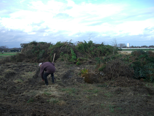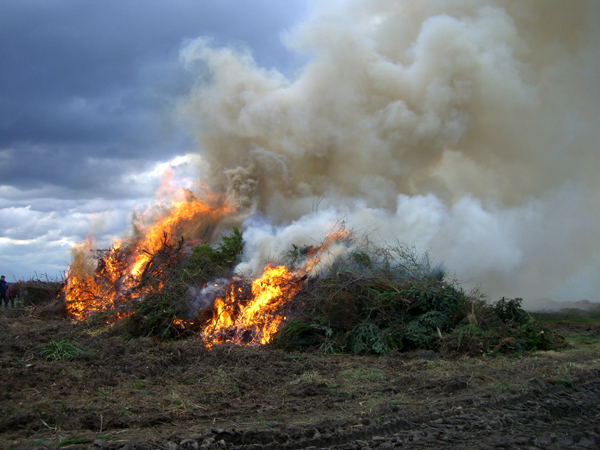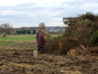 Durch tagelange Regenfälle ist der schon sumpfige Boden weiter aufgeweicht. Die Traktoren verursachten tiefe Spurrillen im Morast bei der Anlieferung und Transport des Schnittgutes. Das spätere Aufschieben durch Maschinen konnte man in diesem Jahr vergessen. Die Traktoren drohten selbst sich fest zu fahren. Daher war diesmal "Manpower" gefragt. Mit großem Aufwand wurde das Osterfeuer von Hand durch die Mitglieder aufgeschichtet.